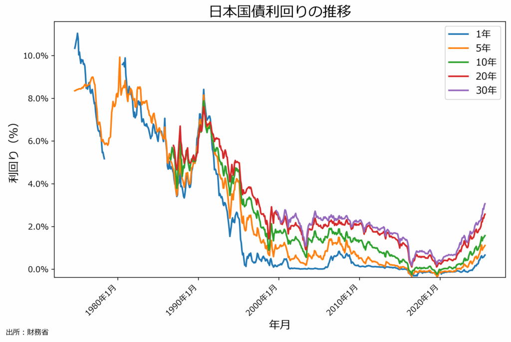 上の図は、1974年9月から2025年8月までの日本国債の金利の推移を満期別に線グラフにしたものである。
