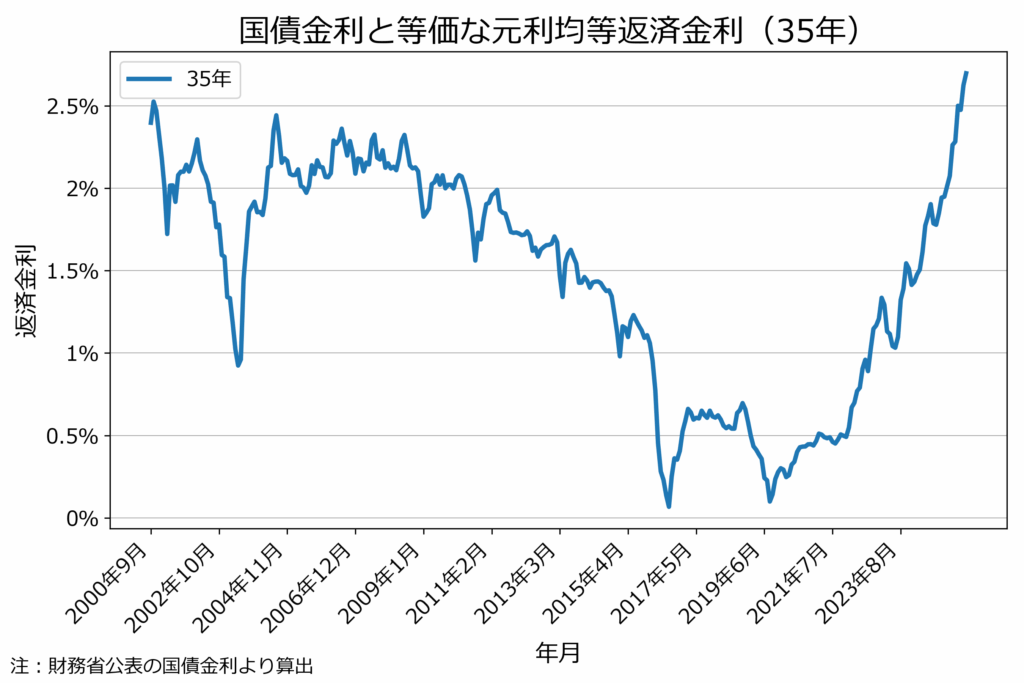 上の日本国債と等価な35年元利均等返済金利は、2000年代には2%越えが普通であったのが、2010年代に徐々に下がり始め、2016年ごろからイールドカーブコントロールによって急激に低下していることが分かる。その後、コロナ禍でまた0%近くまで下がった後ここ3年程急激に上昇している。