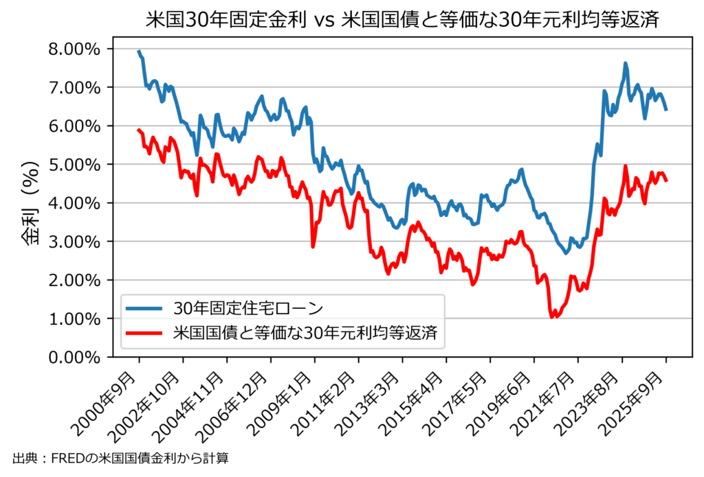 上の図は、米国の住宅ローン30年固定金利と米国国債と等価な30年元利均等返済金利である。米国国債と等価な元利均等返済金利というのは、もしそれぞれの年限で米国国債のゼロクーポン債と同じだけの利子を払う元利均等返済の金利のことである。二つの金利の差のことをスプレッドという。米国10年国債などが比較対象として使われることもある(というかその方が多い)が、より比較対象として適当であるという理由で米国国債と等価な30年元利均等返済金利を選んだ。